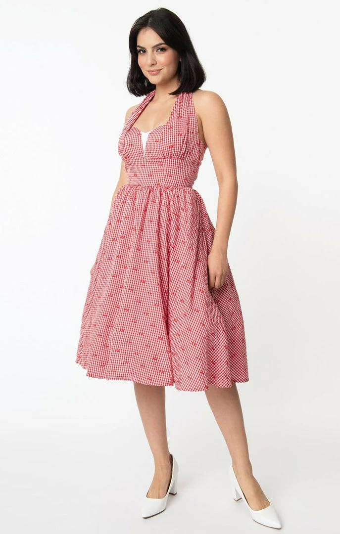 A retro legend, dames! Presenting a stunning mid-century inspired silhouette from Unique Vintage, the Shelia Dress is crafted in a lightweight woven fabric that dances with red cherries printed throughout the red and white gingham pattern. The self tie halter secures the sweetheart bodice while the banded waist is cinched with a back zipper. The gathered swing skirt drops to your knees, outfitted with side pockets for modern fun!