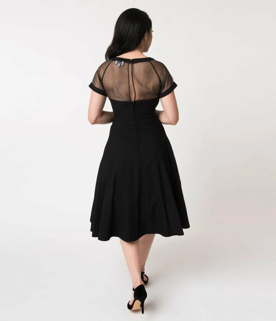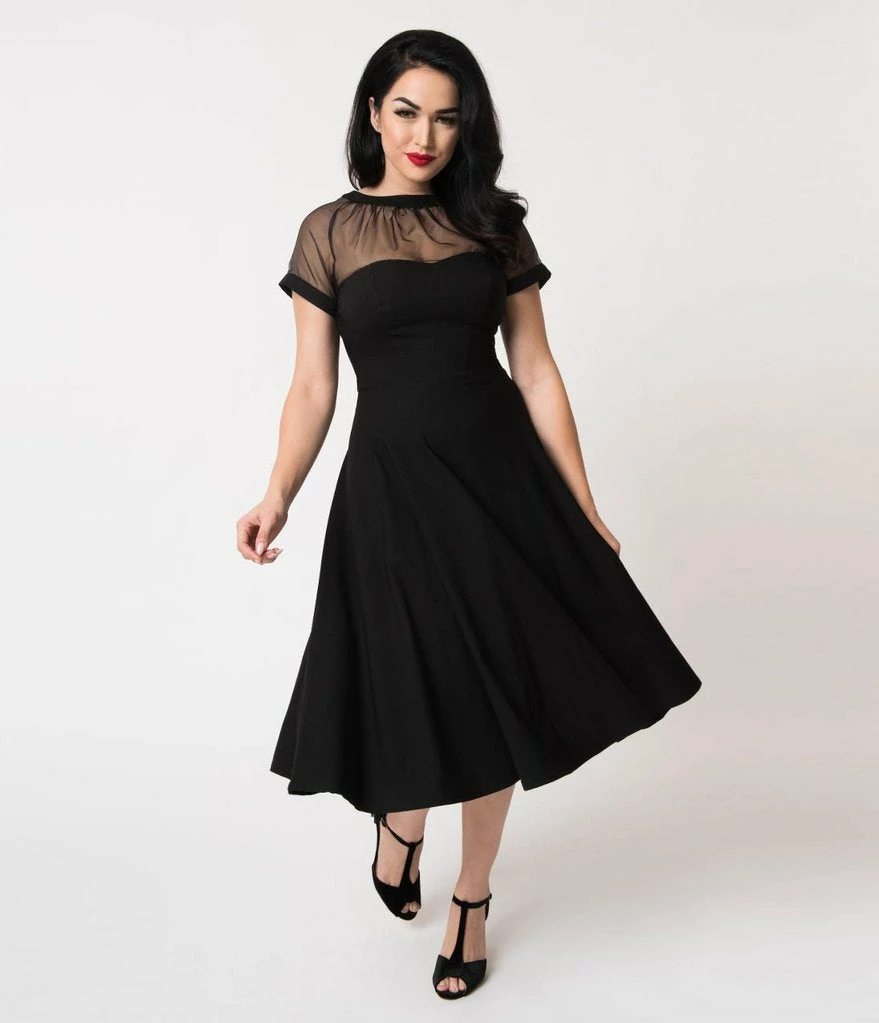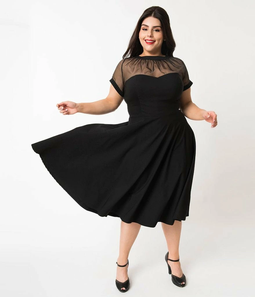 Polished to perfection, this elegant black frock from Unique Vintage is a vintage performance to remember. The plus size Shirelle Dress is crafted in a beautiful black stretch blend in a graceful mid-century silhouette. The sweetheart cut and princess seamed bodice boast a beautiful sheer neckline in an exquisite poly organza that gathers toward the color blocked high neck and drops around the back to a sultry button keyhole and framed by sweet short sleeves. The seamed waist centers your figure as the dramatic swing skirt cascades to a straight hem below the knees. Outfitted with a back zipper to nip in your hourglass, add Shirelle to your playlist and get inspired!