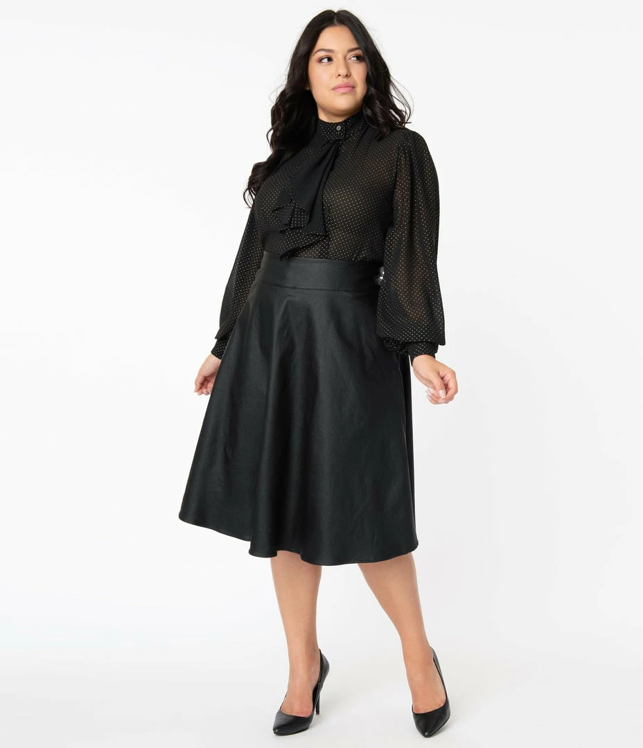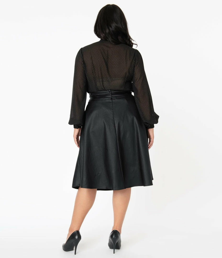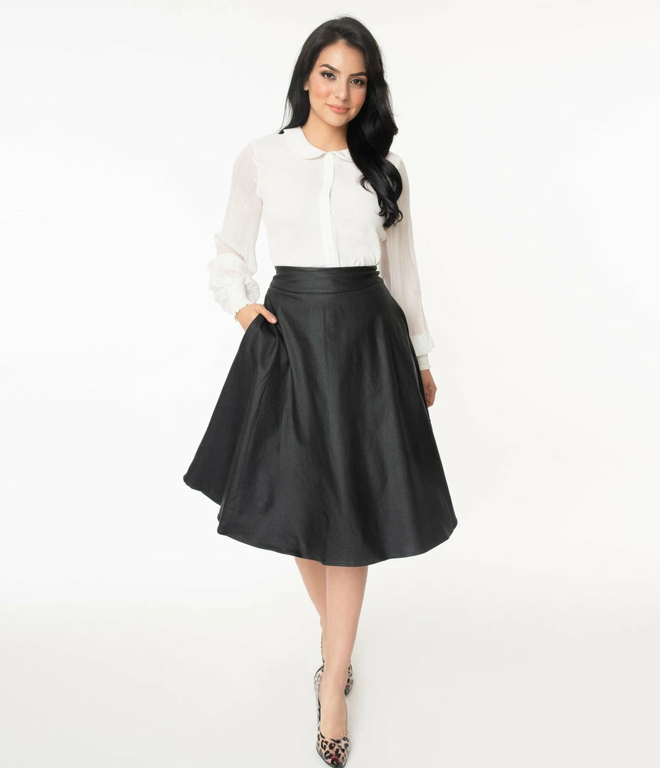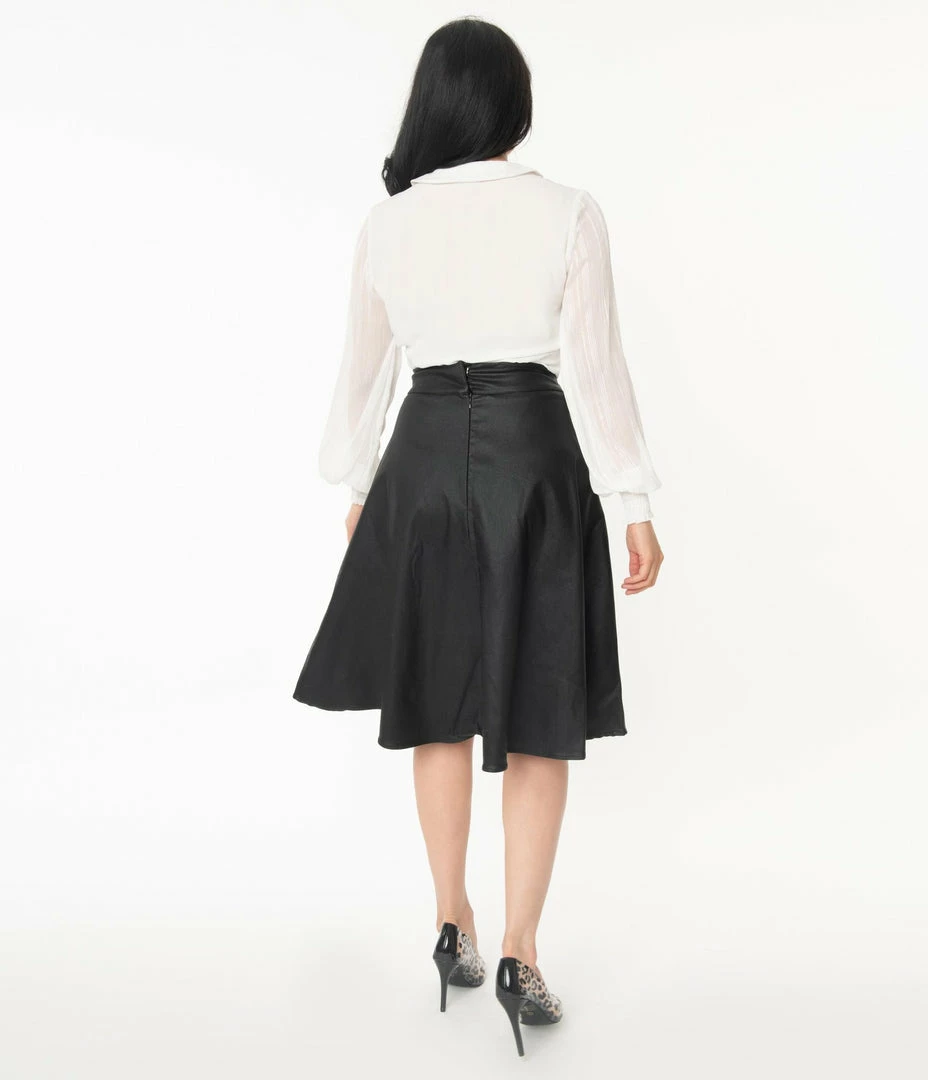 Vivien is ready to buck the rules, gals! A gorgeous 1950s style swing skirt that rests high on the natural waist, the Vivien skirt is cast in a fabulous black vegan leather. Marvelously created by Unique Vintage and boasting functional side pockets for your hidden accouterments, thick banding and a back zipper and twin metal double hook closure. Raise the stakes!