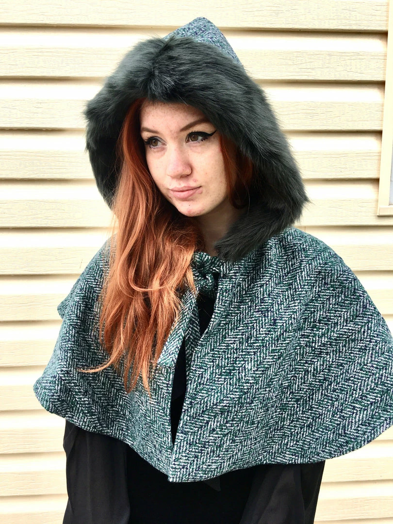 A rich dark green and navy herringbone tweed with luscious faux fur trimmed hood…perfect for Fall.